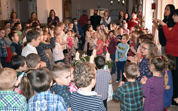 Az óvó nénik és dadus nénik a gyerekekkel közösen, dalokkal köszönték meg az ajándékot.